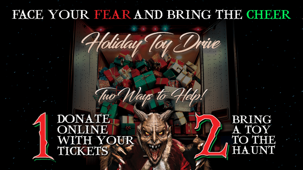 Bring a new, unopened toy* with you to the haunt or you can donate to the toy fund directly when you purchase your tickets online in the add-on section.